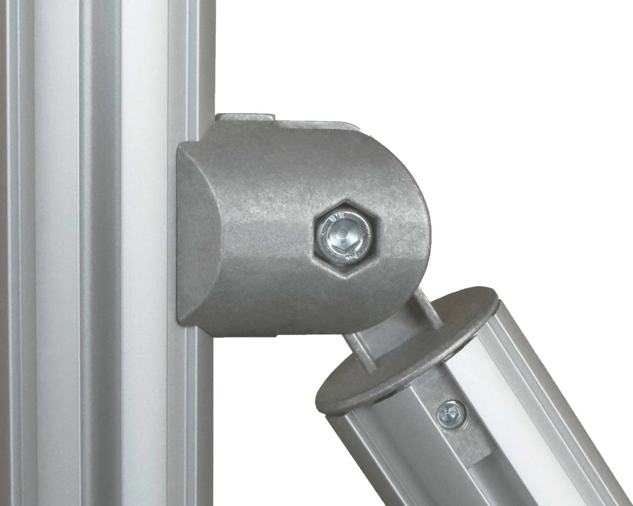 Universell verwendbar an Diagonalstreben oder Winkelverbindungen. Zwei Nasen greifen in die seitlichen Profilnuten und werden mit Madenschrauben gesichert.