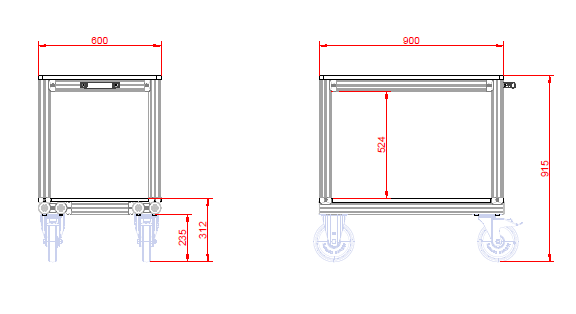 Zwei Lenkrollen mit Feststeller, zwei Bockrollen.