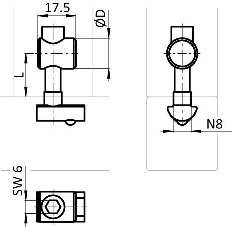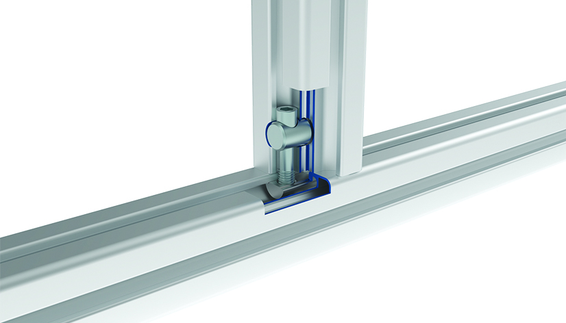 Für die rechtwinklige Verbindung zweier Aluminiumprofile. Erfordert zur Montage eine seitliche Bohrung mit Ø 14 mm in einem der Profil.