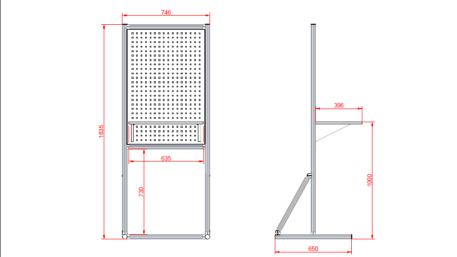 Center-Point mit Ablage melaminbeschichtet 635x400x19 mm und Lochblech ähnlich RAL7035 986x666 mm.
