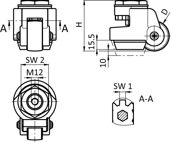 Robuste Feststellrolle mit M12-Rückenlochgewinde zur Montage an Transport- und Bodenplatten, Gewindehülsen oder Gewindestopfen. Die Rollenbewegung wird durch kurzzeitiges Absenken des Stempels blockiert, wobei die Höhenverstellung des Stempels über ein Verstellrad im Rollengehäuse mit Gabelschlüssel gesteuert wird.