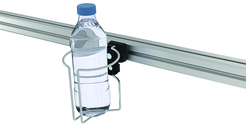 Einsatzbereiter Flaschenhalter, 360° drehbar, speziell für Aluminiumprofile. Ideal zum Organisieren von Arbeitsplätzen.
