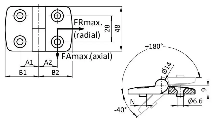 Zum Einsatz an NGP40 für Flächenelemente und Aluminiumprofile. Öffnungswinkel -40° bis 180°. Links angeschlagen, aushängbar.