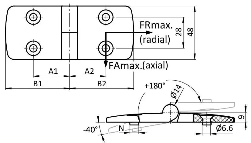 Zum Einsatz an NGP60 für Flächenelemente und Aluminiumprofile. Öffnungswinkel -40° bis 180°. Rechts angeschlagen, aushängbar.
