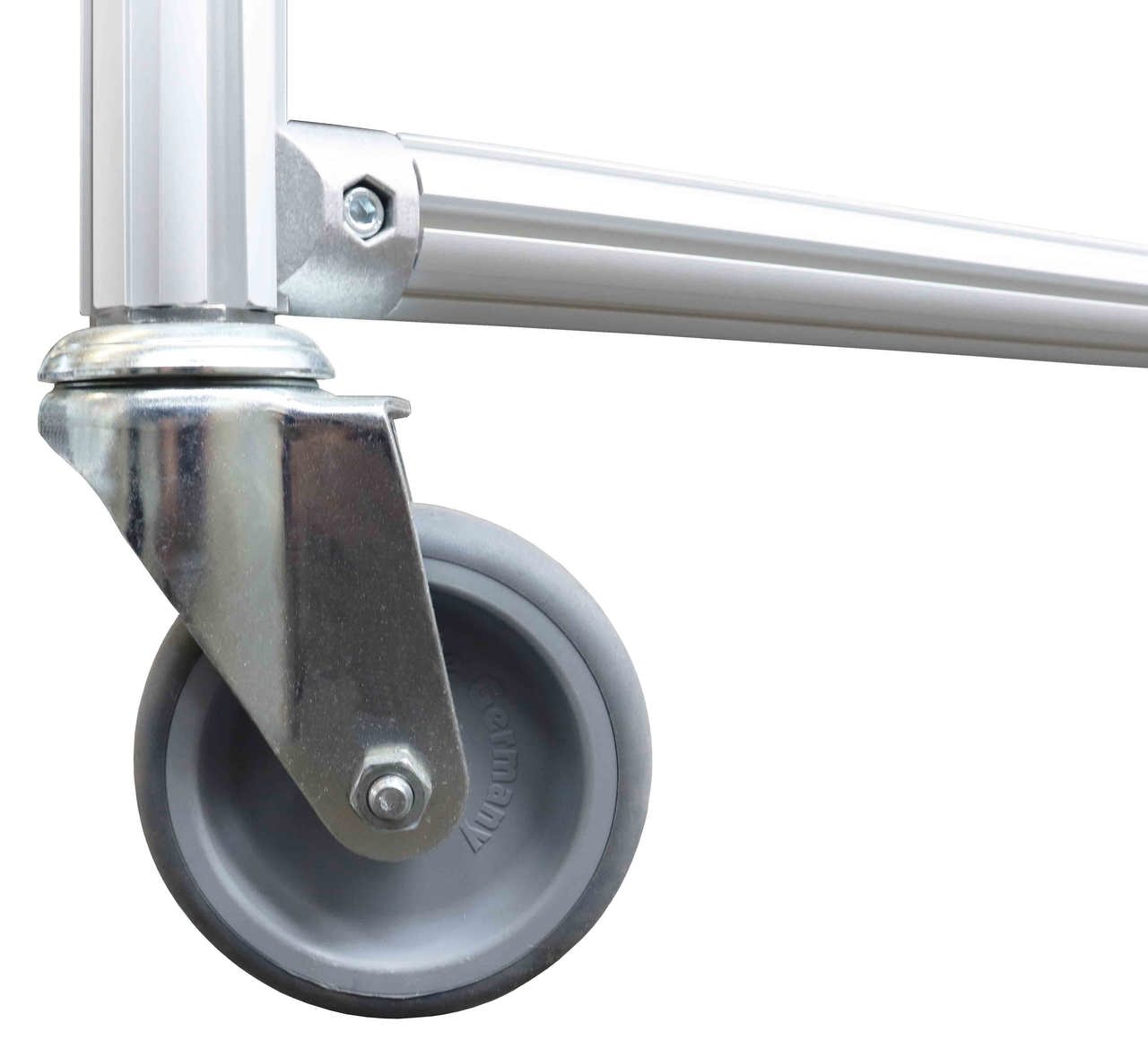 Feststellhebel für Lenkrollen mit Feststeller aus Stahl. Laufbelag des Rades aus hochwertigem, thermoplastischem Gummi-Elastomer (TPE), ölhaltig, 85° Shore A,