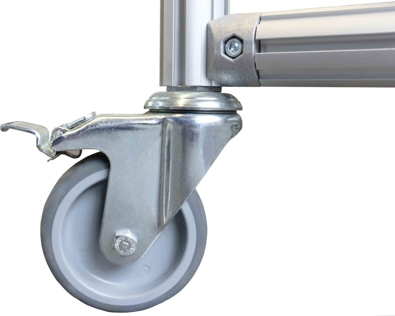 Feststellhebel für Lenkrollen mit Feststeller aus Stahl. Laufbelag des Rades aus hochwertigem, thermoplastischem Gummi-Elastomer (TPE), ölhaltig, 85° Shore A,