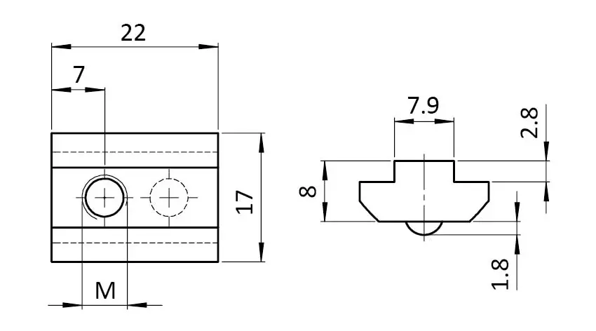 Nutenstein Nut 8 M6 17x8mm, Führungssteg hoch; I=22mm