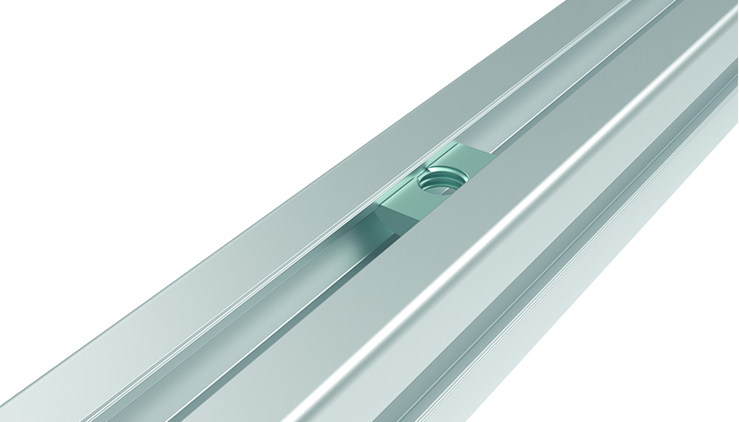 Einschwenkbarer Nutenstein Nut 8 M8 mit Führungssteg und integrierter Federblech.