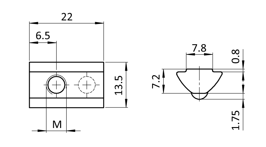 Nutenstein Nut 8 M8 13,5x7,2mm, einschwenkbar, Führungssteg; I=22mm,