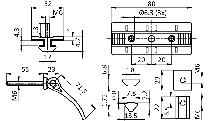 | Material: | Gleitschlitten: Zinkdruckguss, Gleitschuh: Kunststoff POM, Befestigung: Stahl, Exzenterhebel: Kunsts |
