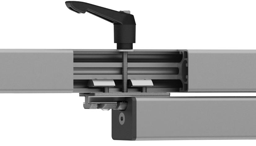 Für die flexible Führung von Profilen mit Nut 8 und Festlager sorgt eine zusätzliche Klemmung des Schlittens für erweiterte Einsatzmöglichkeiten, beispielsweise als verstellbarer Endanschlag. Bei maximalem Anzugsmoment von 15 Nm beträgt die Haltekraft 600 N.
