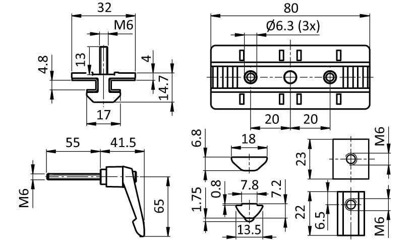 - 1x Klemmhebel mit Aussengewinde M6 x 55