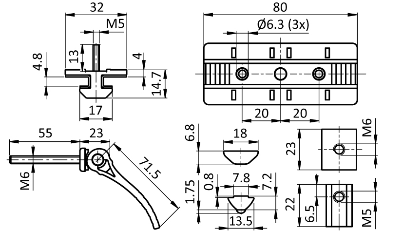 | Material: | Gleitschlitten: Zinkdruckguss, Gleitschuh: Kunststoff POM, Befestigung: Stahl, Exzenterhebel: Kunsts |