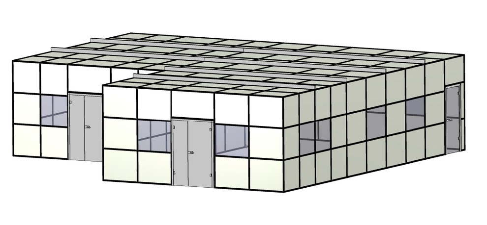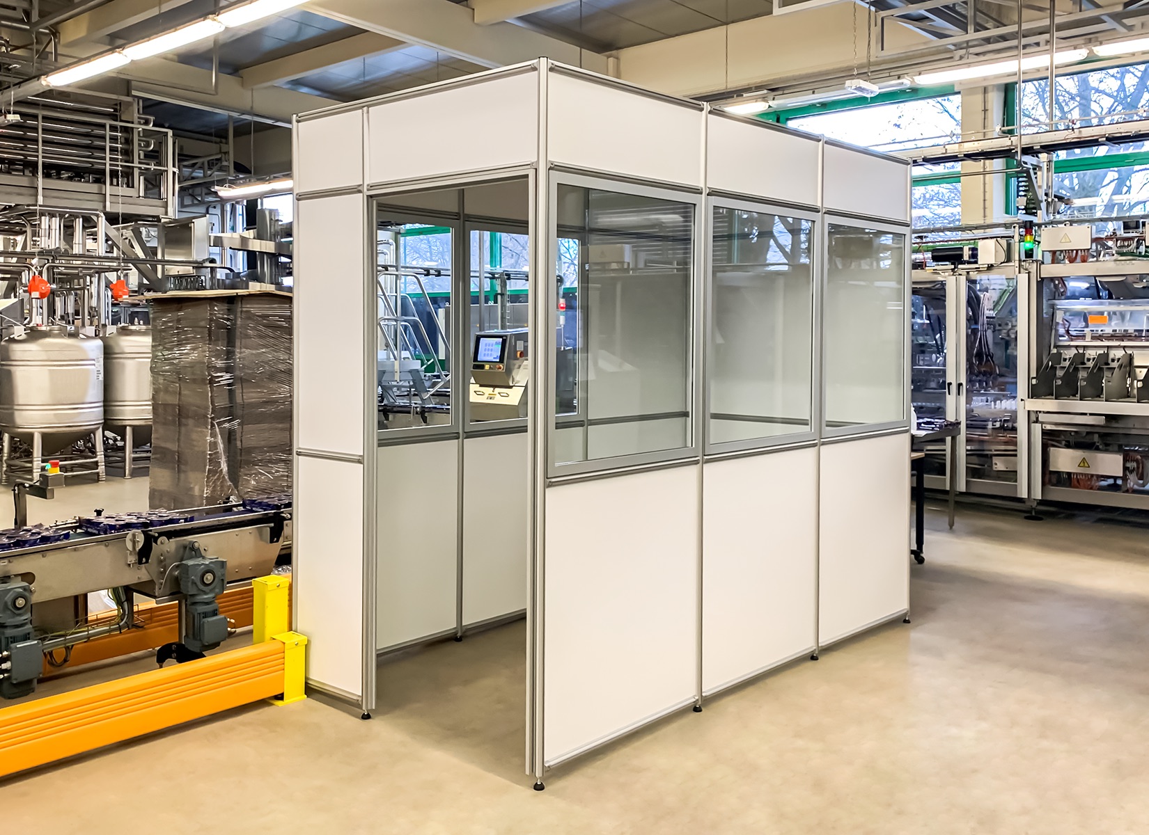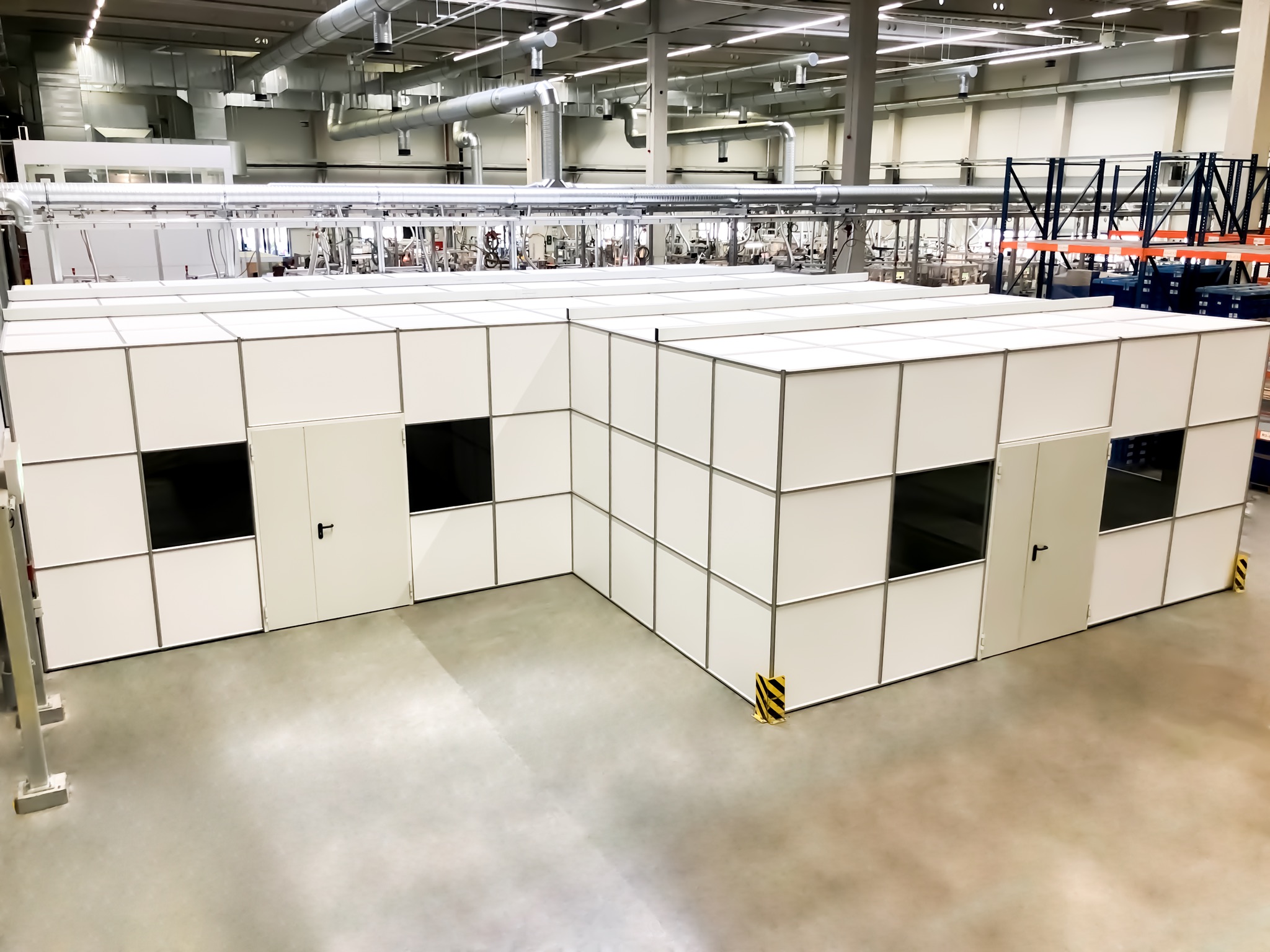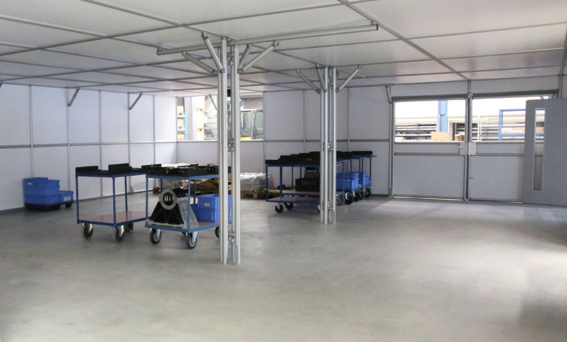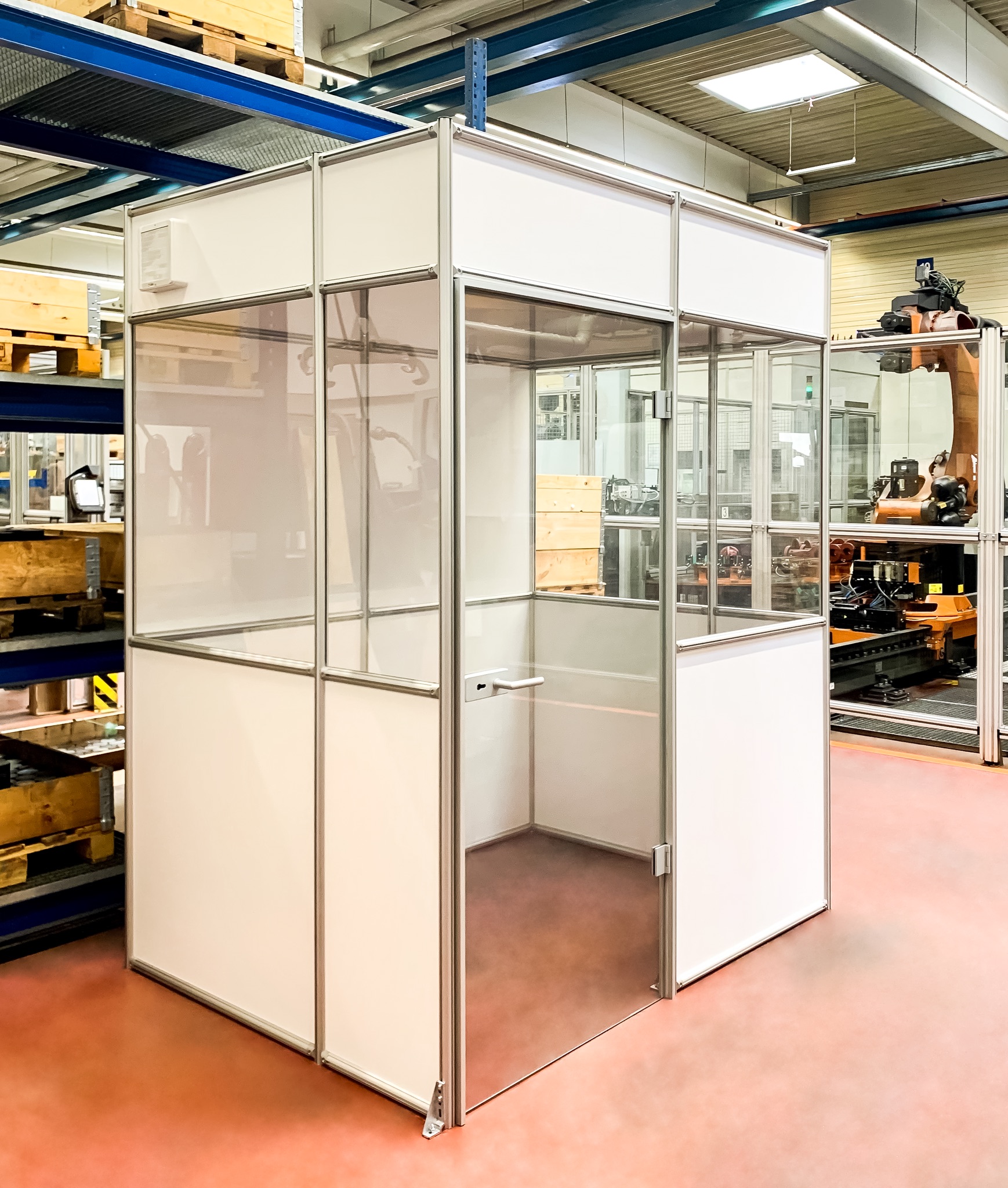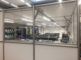 Mit einem Hallenbüro, auch Meisterbüro genannt, einem Sauberraum oder auch Besprechungs- und Pausenraum können Prozesse in Industriehallen abgegrenzt werden. Aufgebaut auf unserem Aluminiumprofil System sind Sie in der Gestaltung absolut flexibel. Die Raumaufteilung auf einer oder zwei Etagen ist genauso möglich, wie das Umbauen und Integrieren von zum Beispiel vorhandenen Installationen. Mit verschiedenen Füllmaterialien können Ansprüche an Optik und Eigenschaften, wie die Akustik-Optimierung, eingeplant werden.