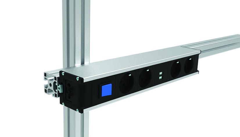 Schaltbare Steckdosenleiste mit integrierten Steckdosen zur Stromversorgung an Arbeitsplätzen, zusätzlich ausgestattet mit 2 USB-Ladebuchsen (USB 2.0 Typ A) mit Smart-IC-Technologie. Rückseitig mit einer Nut 8 versehen, ermöglicht eine einfache Montage an Aluprofilen.