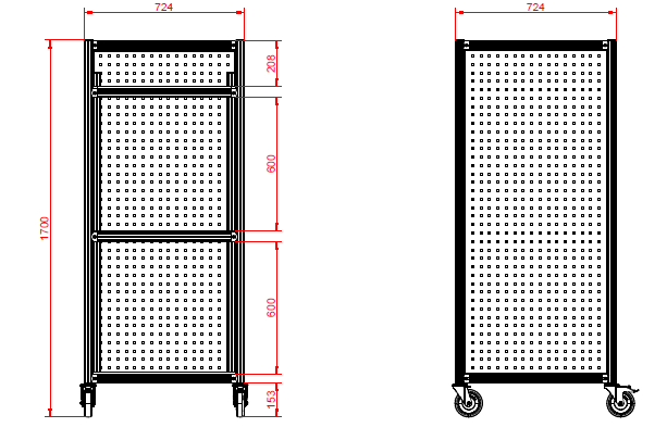 Regalwagen mit Lochplatten HxB 1464 x 645 mm, Lochung 10x10 mm, Raster 38mm um z.B. Werkzeuge aufzuhängen und 3 Ablageböden (2 Höhen einstellbar.