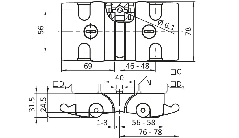 Befestigung: vorderseitig mit Zylinder oder Linsenkopfschrauben M6.