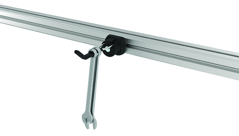 Einsatzbereiter Werkzeughaken, 360° drehbar, speziell für Aluminiumprofile. PVC-beschichteter Draht, um das Verrutschen von Werkzeug zu vermeidden. Ideal zum Organisieren von Arbeitsplätzen.