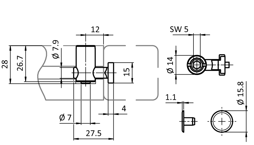Zur rechtwinkligen Verbindung zweier Aluminiumprofile. Erfordert ein seitliches Sackloch von Ø 14,2 mm und 28 mm Tiefe sowie ein stirnseitiges Sackloch von Ø 8,2 mm und 20 mm Tiefe für die Montage. Inklusive passender Abdeckhaube.